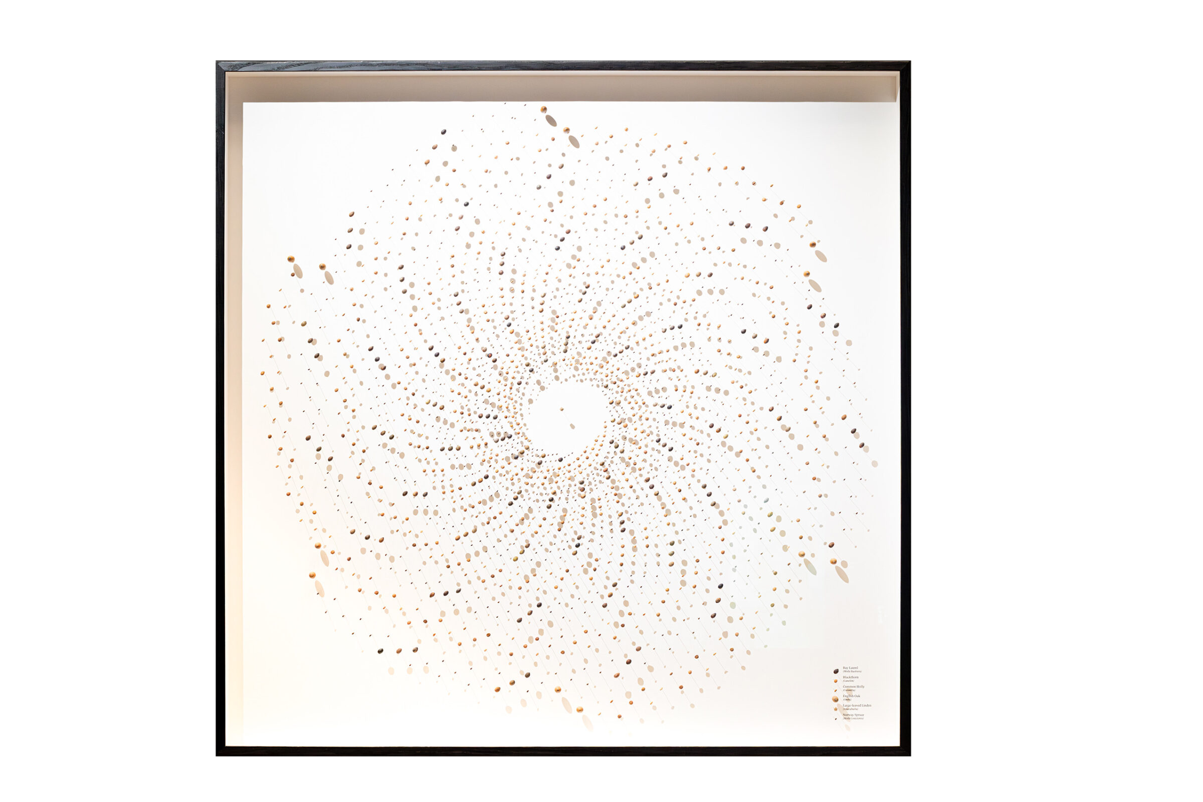 1713 beech seeds, burnt ash wood frame with engraved museum glass